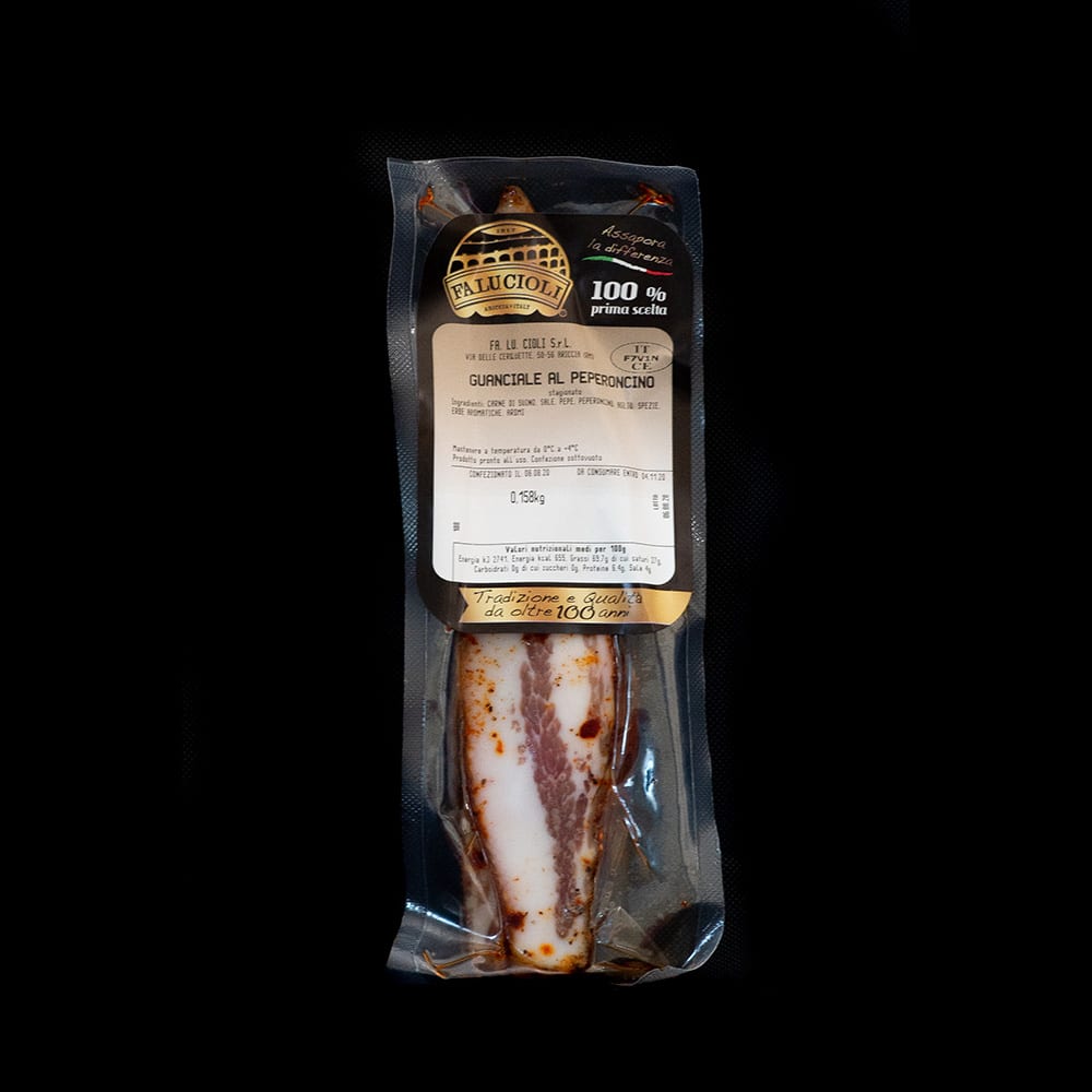 Dalla nostra tradizione il guanciale di maiale è una prelibatezza di gusto prodotto dalla guancia del maiale, un pezzo di carne percoso dalle nervature magre (muscolo) con una componente di grasso pregiato di diversa composizione dal lardo (grasso del dorso) e dalla pancetta (grasso del ventre). La consistenza è più dura rispetto alla pancetta e il sapore caratteristico.